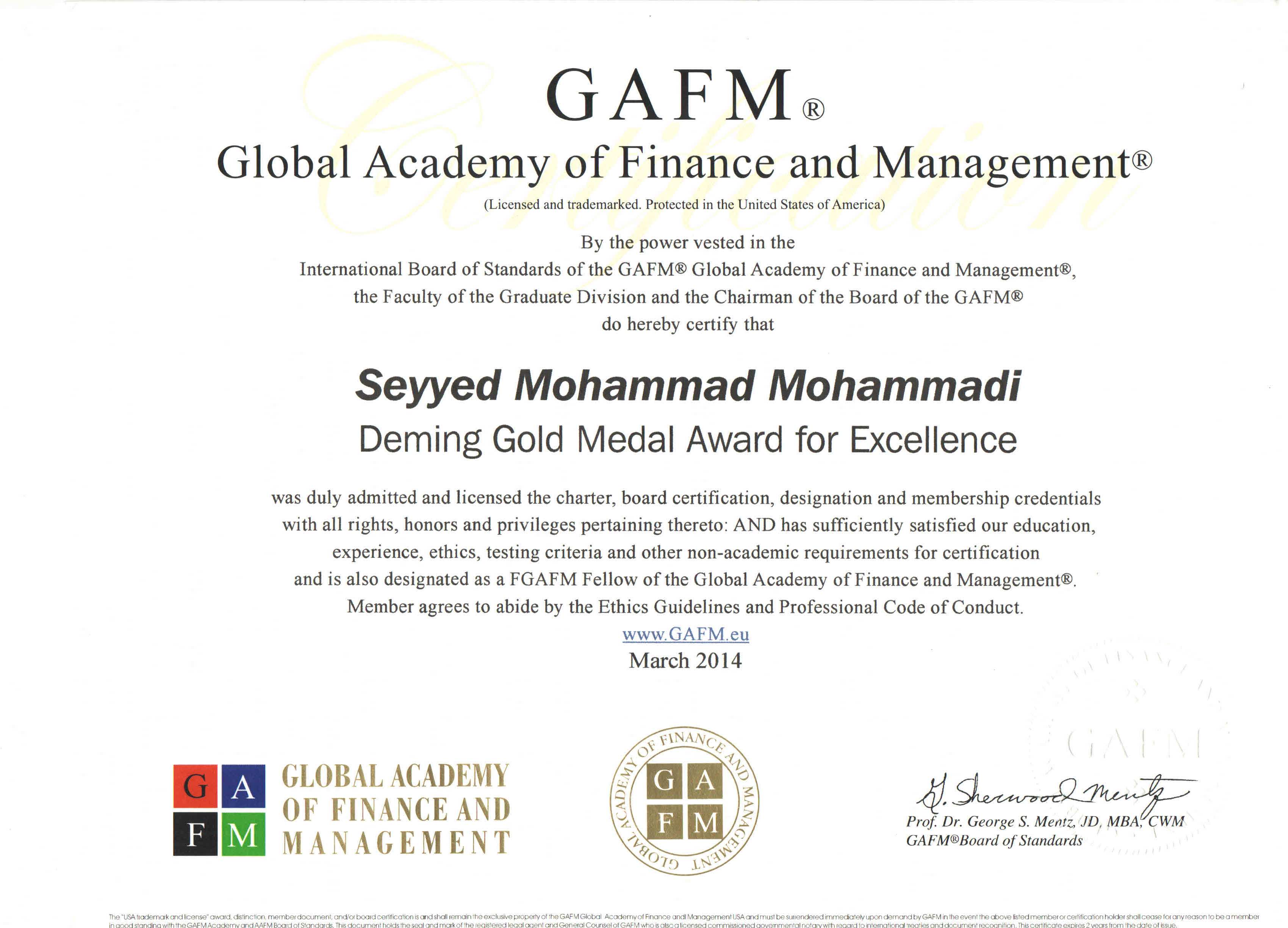 The GAFM ® Board is the 1st Graduate Certification Body to Become Accredited  and Certified for: ISO 9001 Quality and ISO 29990 Training in the World. GAFM ® owns the former AAFM ® Certifications and Programs